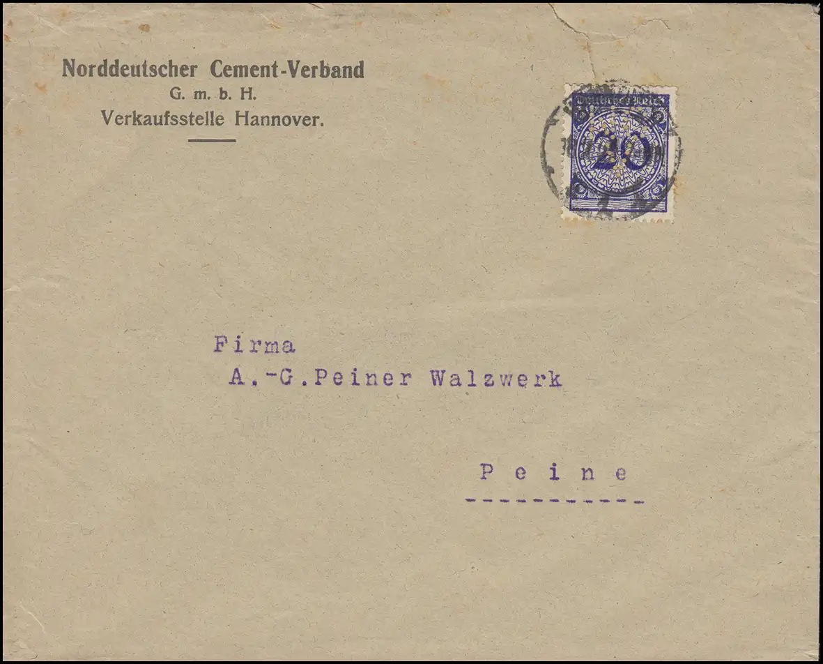 Brief der Firma Norddeutscher Cement-Verband GmbH / Verkaufsstelle Hannover um 1924 an das Peiner Walzwerk. Bedarfserhaltung laut Abbildung.
