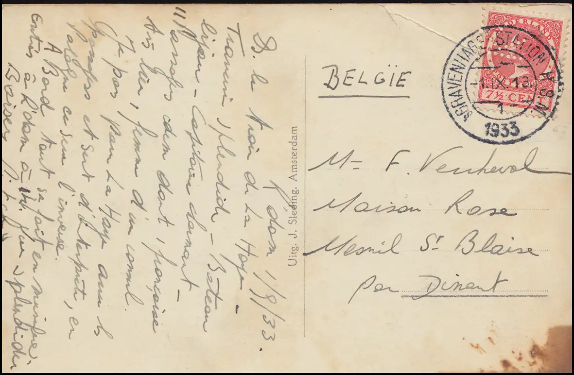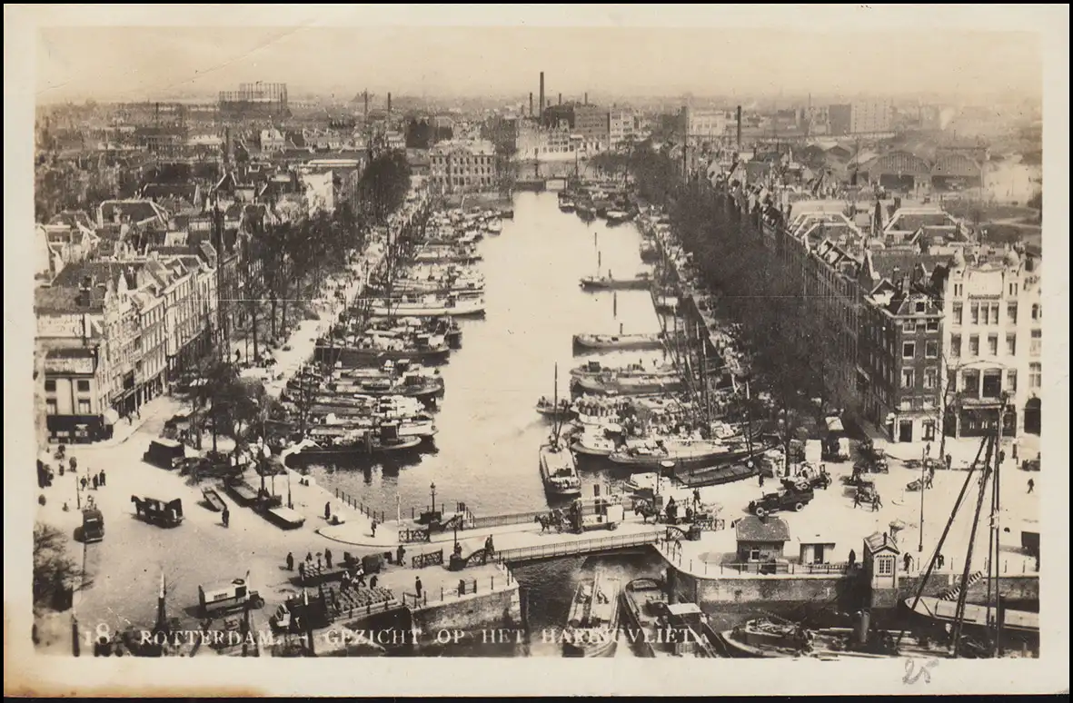 Ansichtskarte "ROTTERDAM. GEZICHT OF HET HARINGVLIET" als Auslandspostkarte nach Belgien, Karte oben rechts Eckknick und unten rechts stockig laut Abildung
