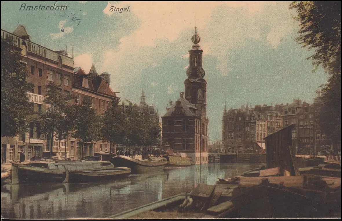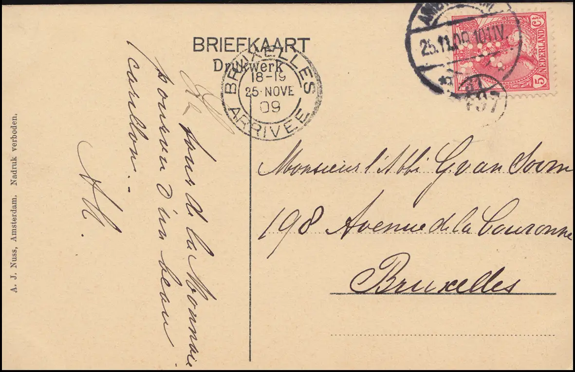 Firmenlochung/Perfin K auf 54 Wilhelmina auf AK Singel, AMSTERDAM 25.11.09
