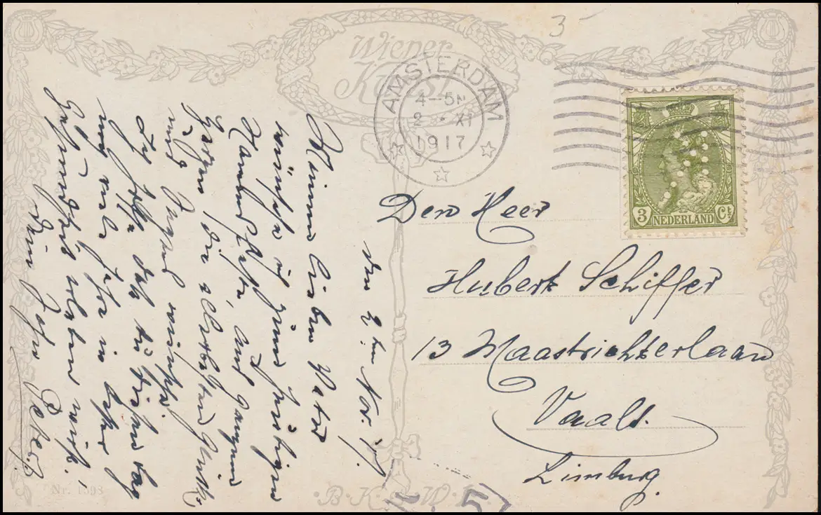 Firmenlochung/Perfin K auf 67 Wilhelmina auf AK Feierabend, AMSTERDAM 2.11.17