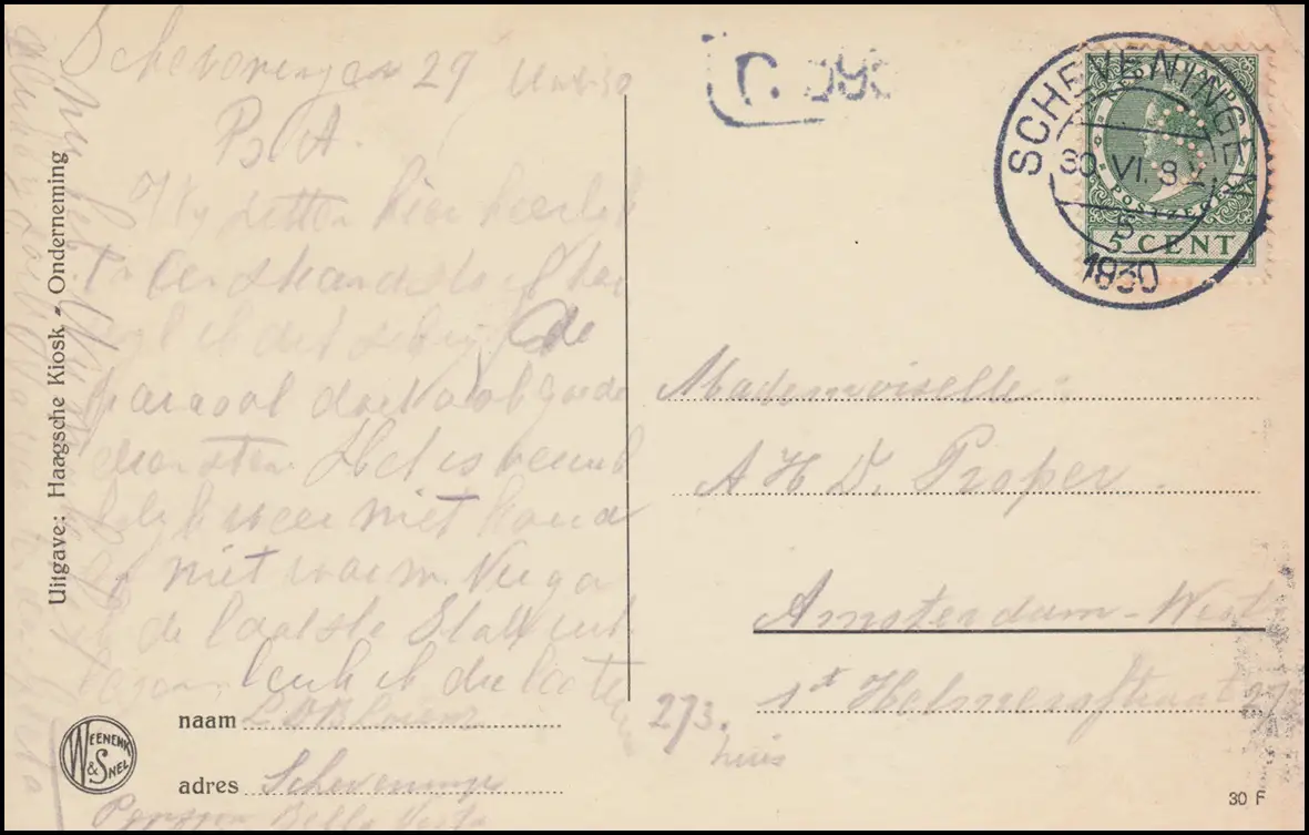 Firmenlochung/Perfin S auf 151 Wilhelmina AK Rittersaal, SCHEWENINGEN 30.6.30