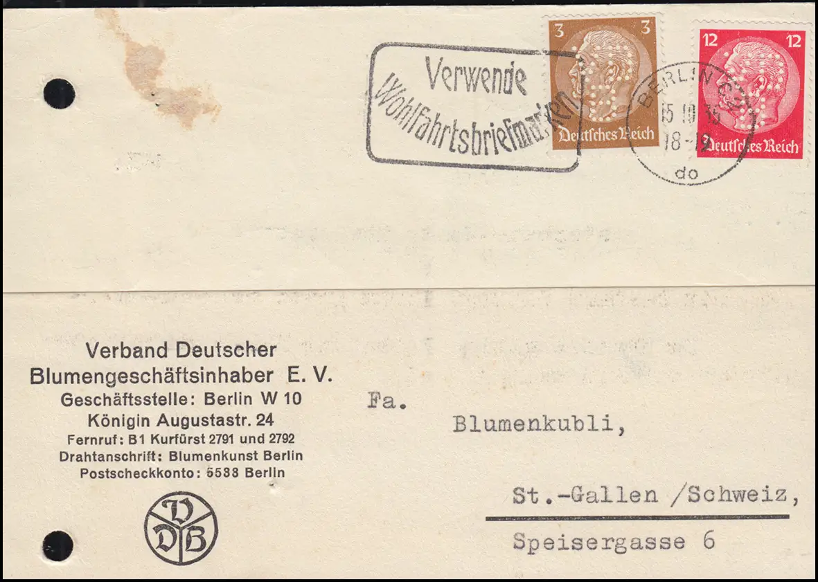 Firmenlochung VDB auf Hindenburg-Marken 3+12 Pf. MiF Postkarte BERLIN 15.10.35