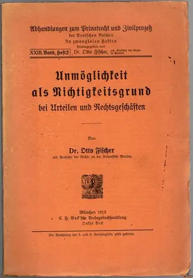 Fischer, Otto: Unmöglichkeit als Nichtigkeitsgrund bei Urteilen und Rechtsgeschäften. [= Abhhandlungen zum Privatrecht und Zivilprozeß des Deutschen Reiches. XXIII. Band, Heft 2] München, C. H. Beck'sche Verlagsbuchhandlung Oskar Beck, 1912.
