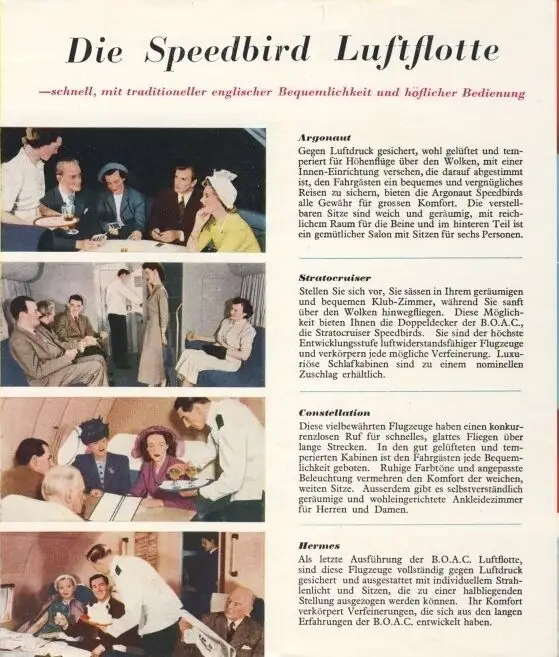 sehr guter Zustand, geringe Gebrauchs- und Alterungsspuren, Deutscher Text: Die Speedbird Reisewege nach allen sechs Erdteilen, kurzer Werbetext zu den Flugzeugen Argonaut, Stratocruiser, Constellation und Hermes, Papier, ca. 9,5 x 22, 8 Seiten mit 8 Farbfotos und Route Map