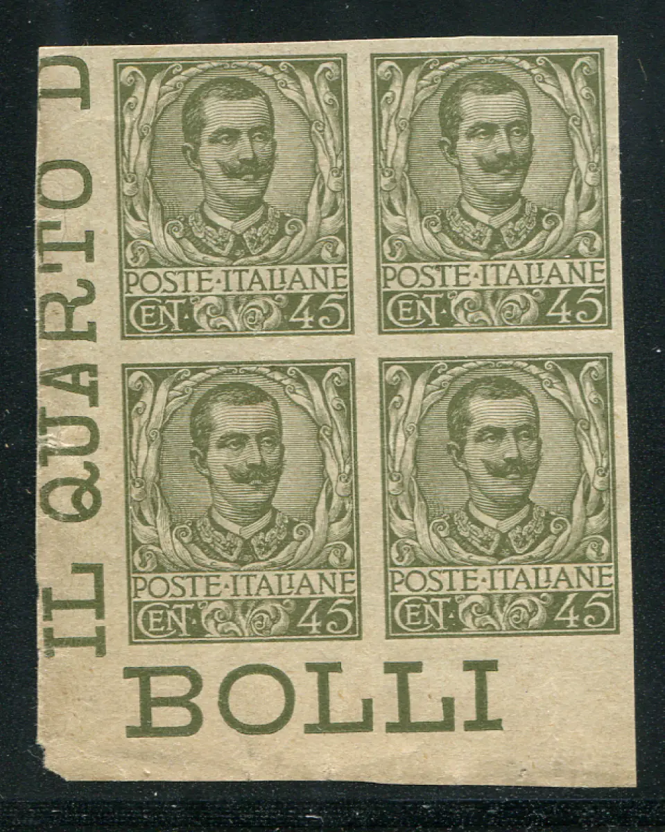 Floreale Cent. 45 Druckprobe auf grauem Papier ohne Gummi - Floral Cent. 45 Nr. 75 Viertel a. f. Druckprobe auf graugrünem Papier, ungezähnt ohne Wasserzeichen - Gebraucht Cod. 92/13
