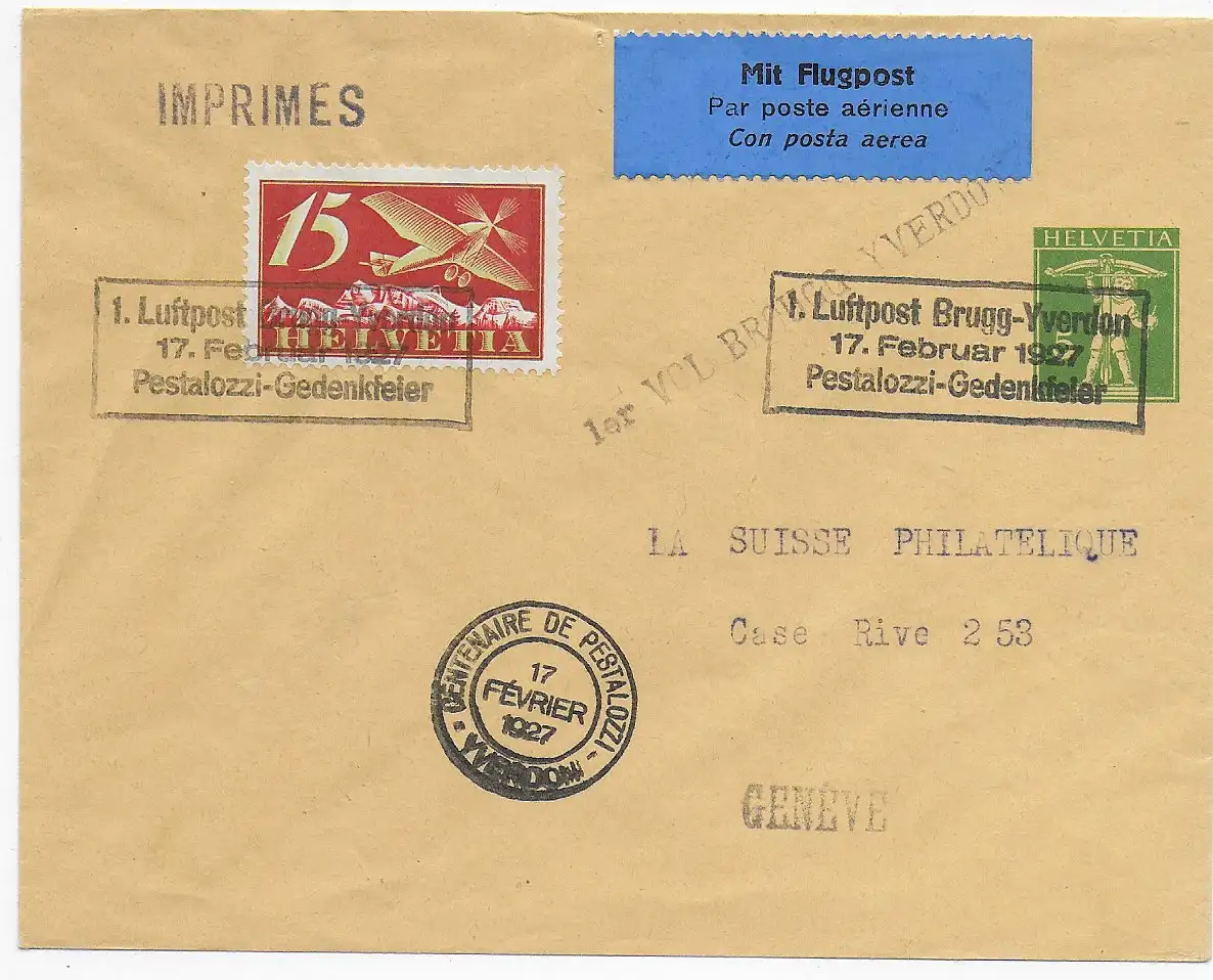 Flugpost: 1. Luftpost Brugg-Yerdon, 1927, Pestalozzi-Gedenkfeier nach Genf
