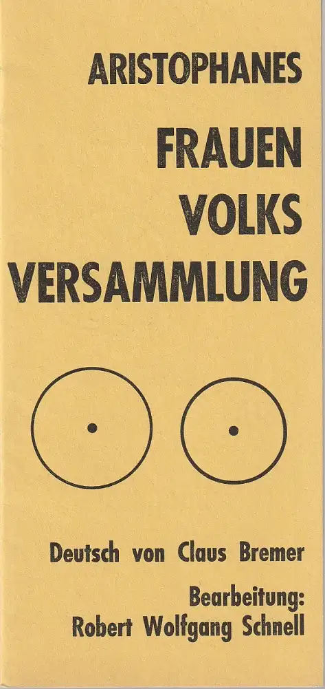 EKKLESIAZUSEN. Deutsch von Claus Bremer. Bearbeitet von Robert Wolfgang Schnell. Inszenierung: Günther Buch. Kostüme: Hansjürgen Rieger. Masken: Riccarda Poppy-Dressler. Mitwirkende: Carin Göpel, Henriette Gonnermann, Ulrike Pohl, Dagmar Dorsten, Günter Kieslich, Norbert Langer, Joachim von Ulmann, Manfred Lehmann, Ralph Steitz ( Persussions ) - Theaterprogramm, Opernprogramm, Ballettprogramm, Musicalprogramm, Konzertprogramm, Theatermemorabilia, Programmhefte Sammlung, deutsche Theatergeschichte.