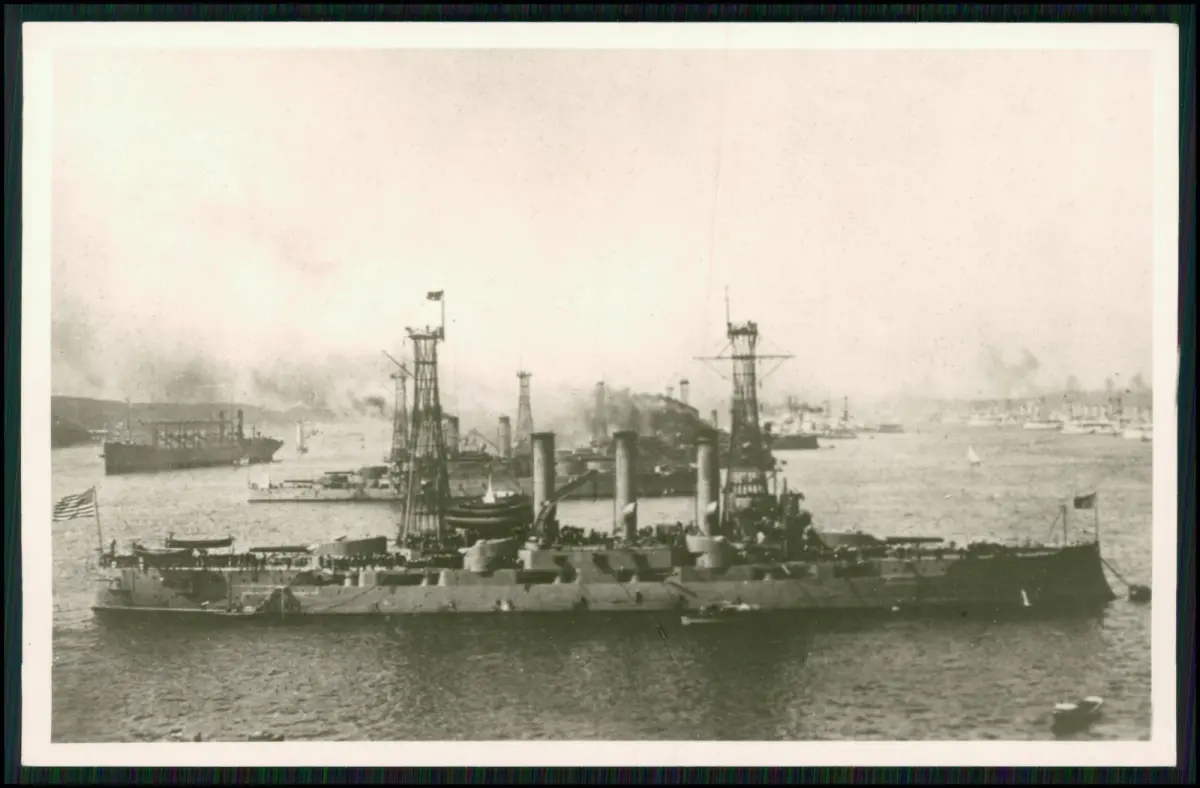 USA Hafen – USS Kansas BB21 der Connecticut Klasse mit klar erkennbaren Käfigmasten, drei Schornsteinen und typischer Turmkonfiguration eines amerikanischen Pre Dreadnought Schlachtschiffs.