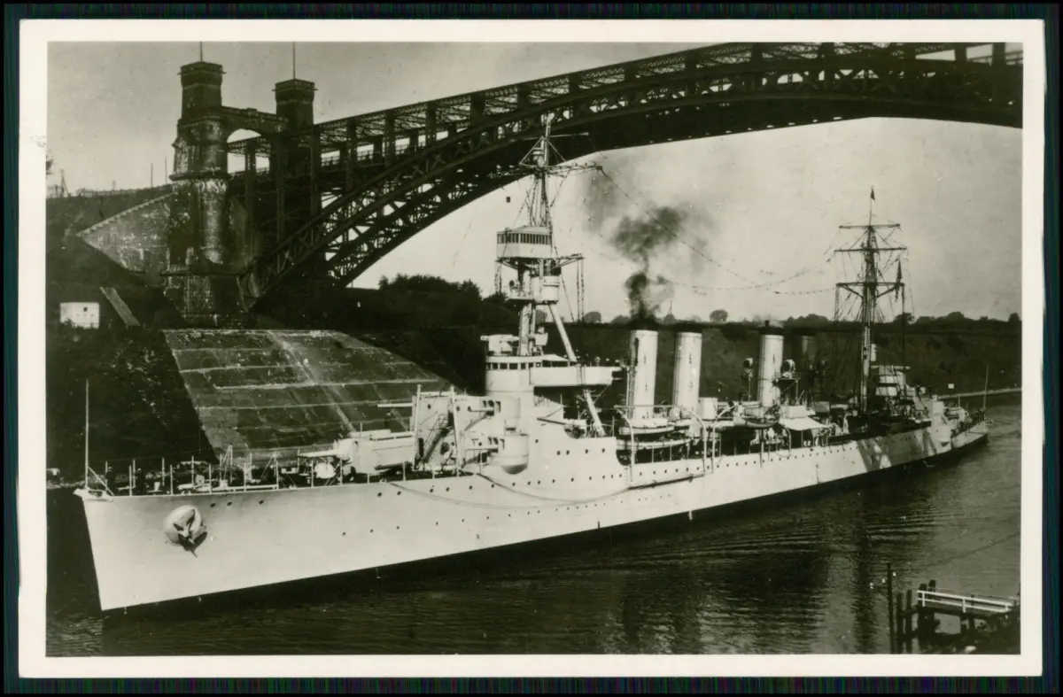 Nord Ostsee Kanal mit USS Marblehead US Kreuzer CL 12 während der Passage unter der charakteristischen Hochbrücke.