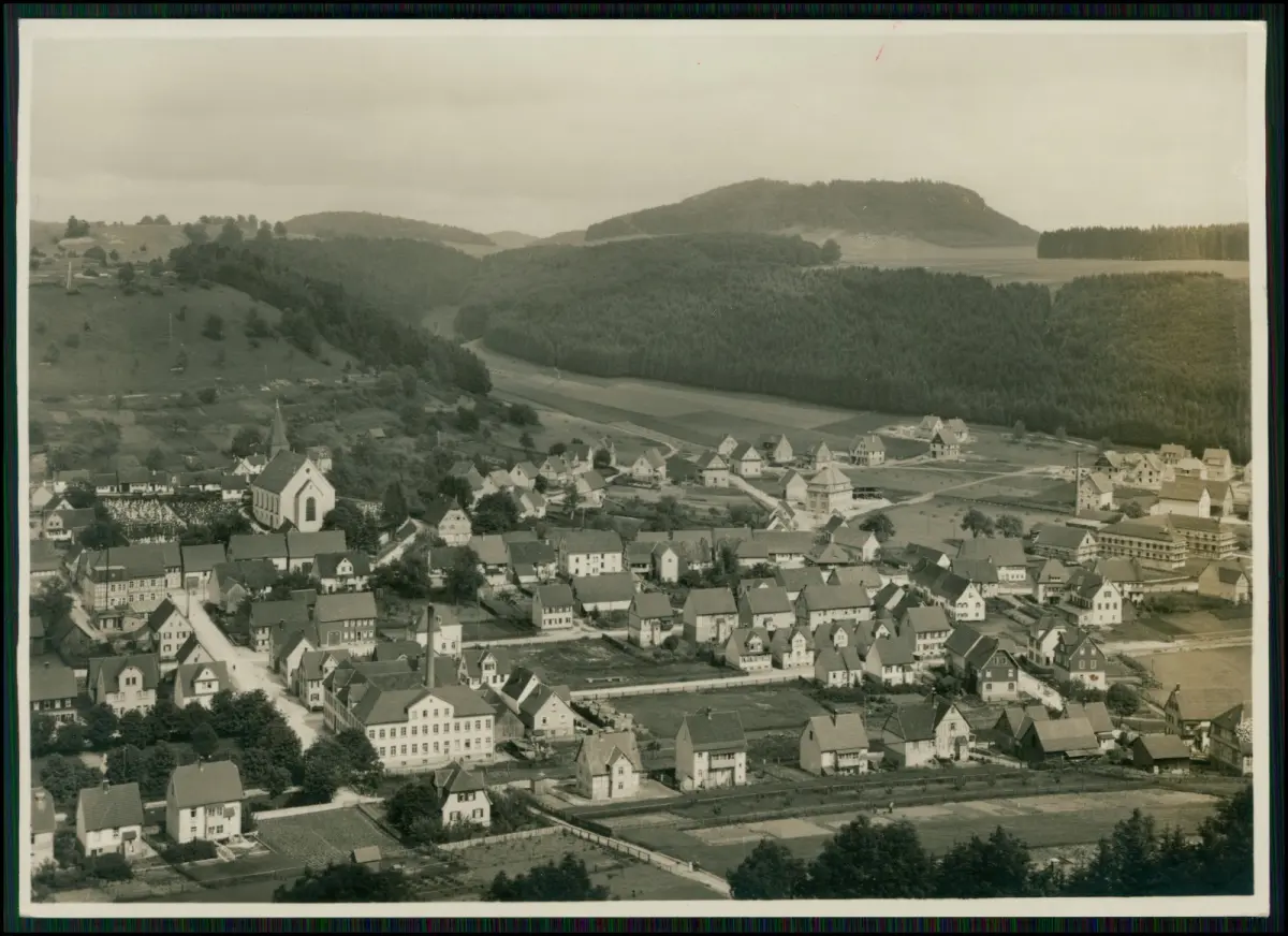Weitblick über Onstmettingen, Hochalb-Dorfkern, markante Kirche, ausgedehnte Wälder, Felder und umliegende Kuppen. Klarer Aufbau und harmonische Darstellung der typischen Albhochfläche.