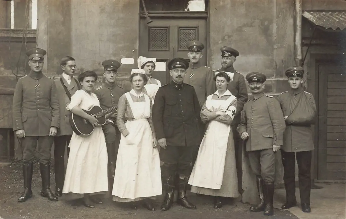Foto 1.WK verletzte Soldaten mit Feldarzt Krankenschwestern vor Lazarett