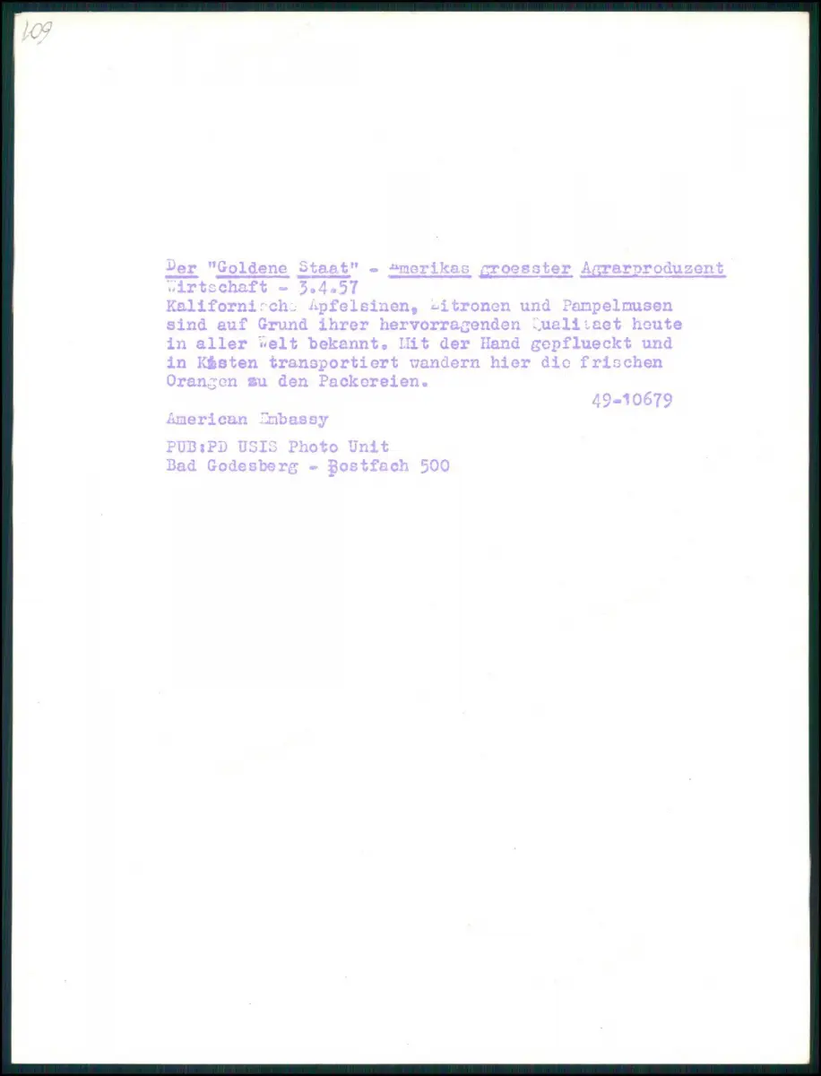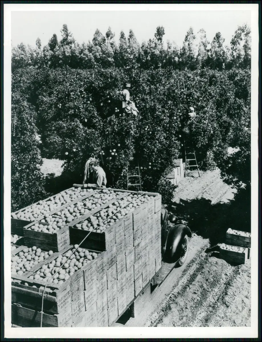 Foto 24x18cm - Orangenernte in Kalifornien - Feldarbeiter füllen Kisten LKW 1957