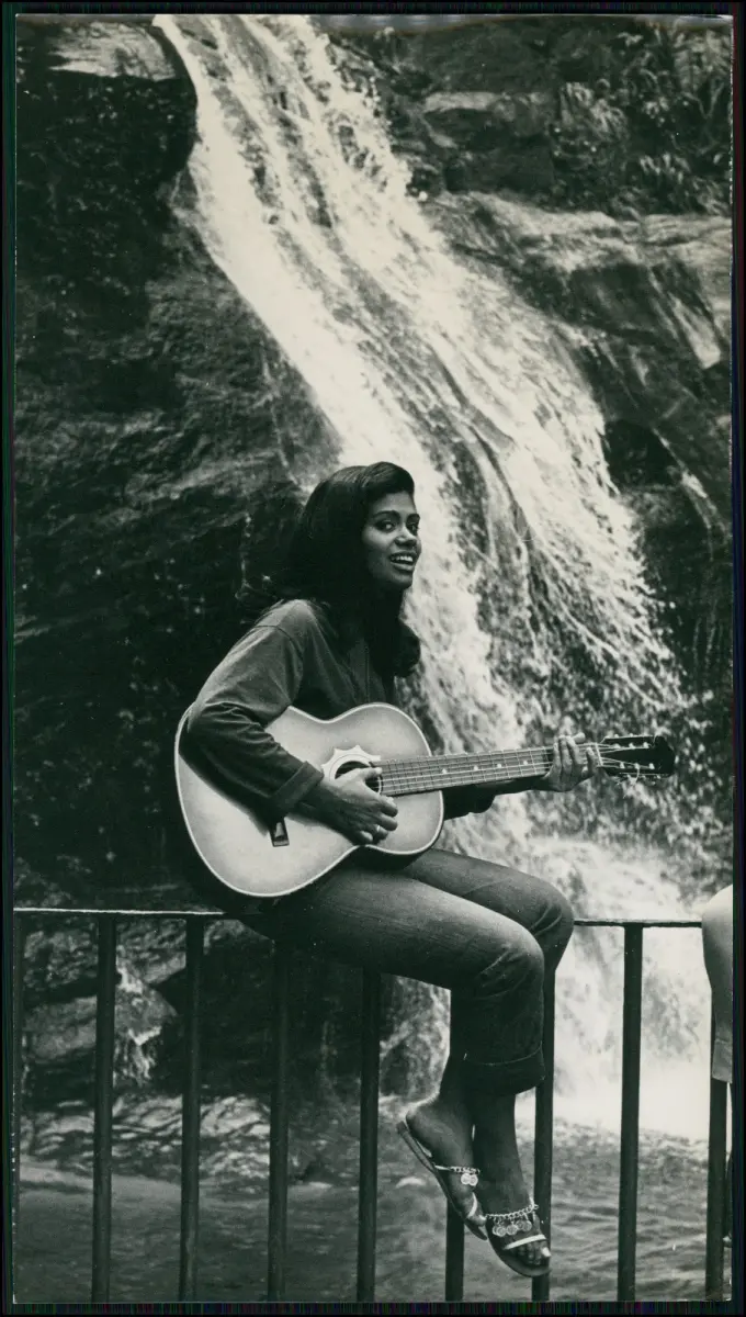 Foto 24x14cm Frau mit Gitarre sitzt lächelnd vor Wasserfall - Rio Brasilien 1958