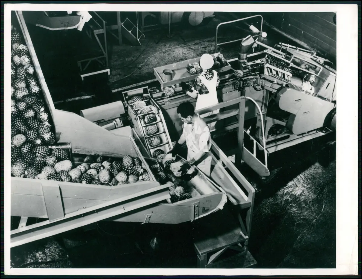 Foto 24x18cm - Ananasverarbeitung Hawaii Dame sortiert Früchte Förderanlage 1958