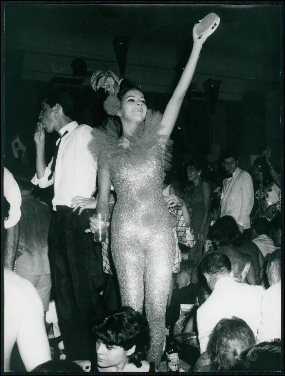 Foto 24x18cm Frau Glitzerkostüm mit Tamburin tanzt Rio Brasilien Karneval 1957