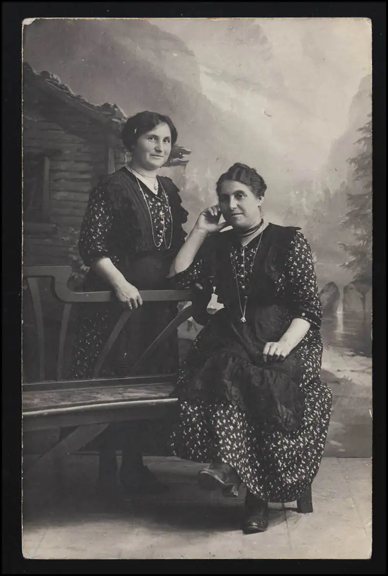 Foto AK 2 Frauen mittleren Alters in Tracht an/auf einer Bank MÜNSINGEN 16.6.15