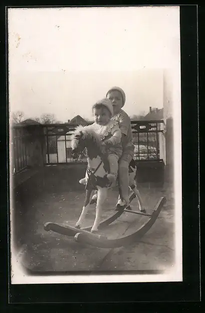 Foto-AK 2 Geschwister sitzen auf einem Schaukelpferd