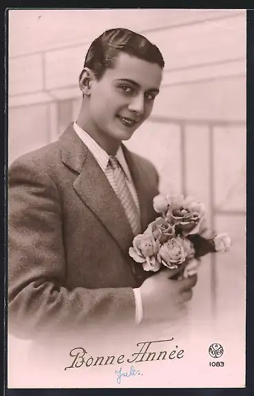 Foto-AK A. Noyer Nr. 1083: Eleganter Herr mit Rosen, Neujahrsgruss