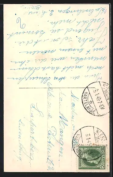 Personenbezogene Daten auf der Rückseite der Karte wurden durch blauen Textmarker unkenntlich gemacht. Die blauen Stellen sind auf die Vorderseite durchgeweicht und wirken sich negativ auf das Postkartenfoto aus