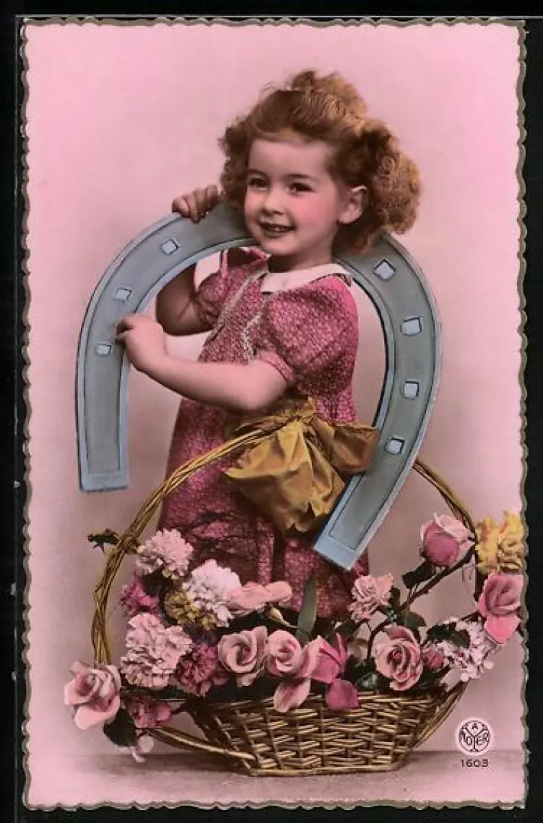 Foto-AK A. Noyer Nr. 1604: Kleines Mädchen mit Hufeisen und Rosenkorb