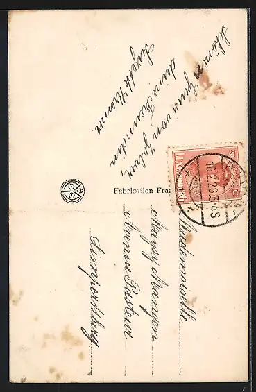 Personenbezogene Daten auf der Rückseite der Karte wurden durch blauen Textmarker unkenntlich gemacht. Die blauen Stellen sind auf die Vorderseite durchgeweicht und wirken sich negativ auf das Postkartenfoto aus
