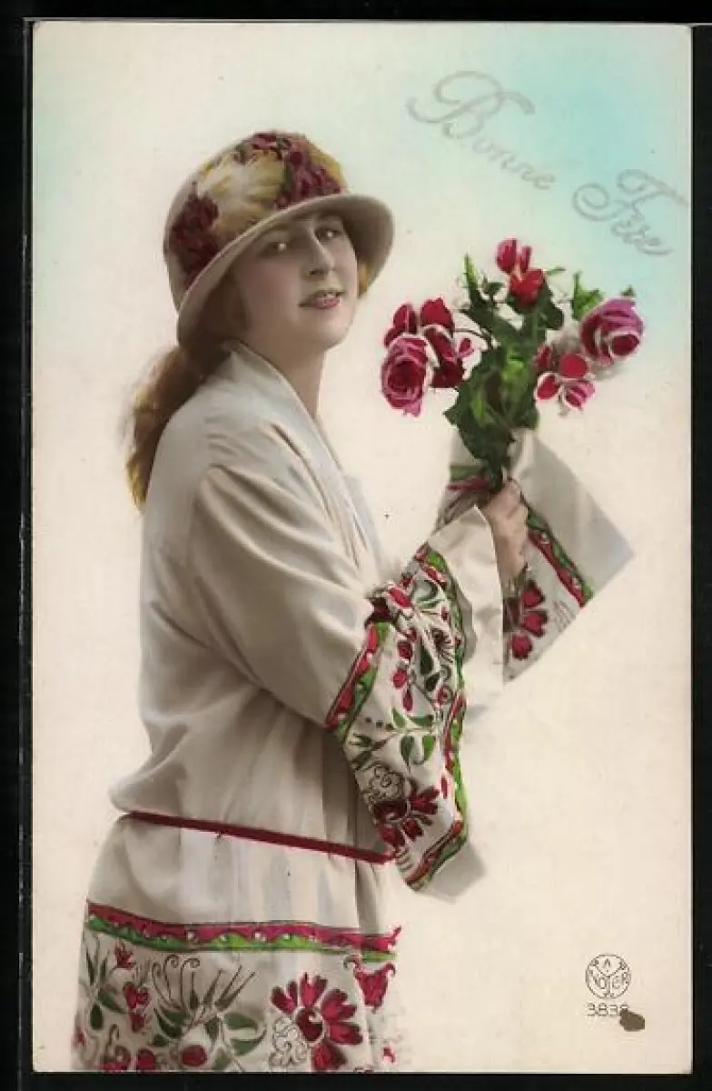Foto-AK A. Noyer Nr. 3838: Mädchen mit Strohhut und Rosenstrauss