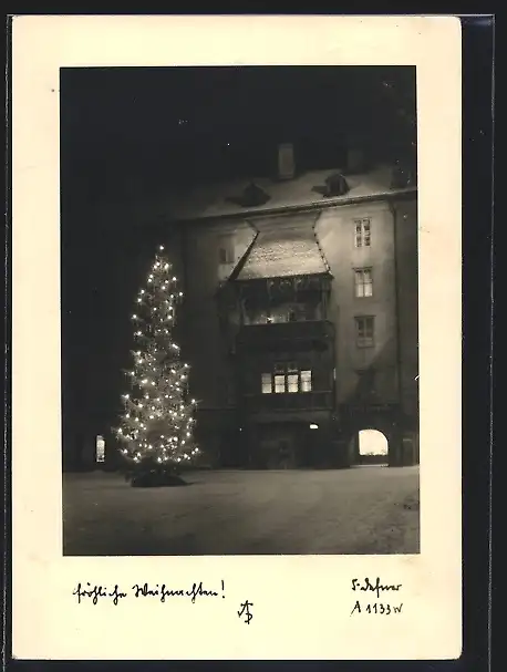 Foto-AK Adalbert Defner: Geschmückter Weihnachtsbaum auf einer Strasse im Schnee