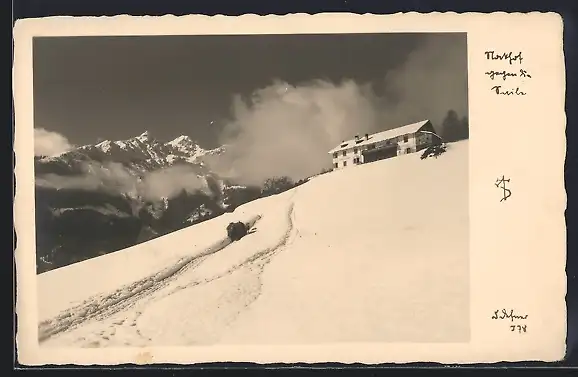 Foto-AK Adalbert Defner: Schneelandschaft mit Haus und Gipfelpanorama