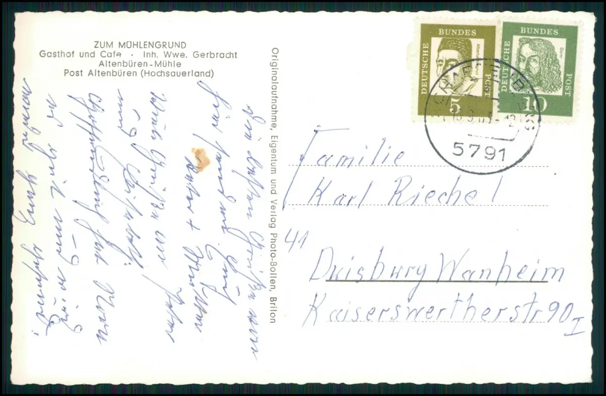 Rückseite: Handschriftlicher Gruß an Familie Karl Riechel, Duisburg-Wanheim, mit Bundespost-Briefmarken (5 Pfennig Albrecht Dürer, 10 Pfennig Leibniz), gestempelt.