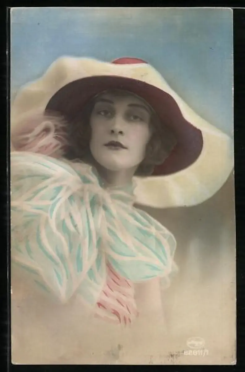 Foto-AK Amag: Frau mit einem Sommerhut blickt den Betrachter an