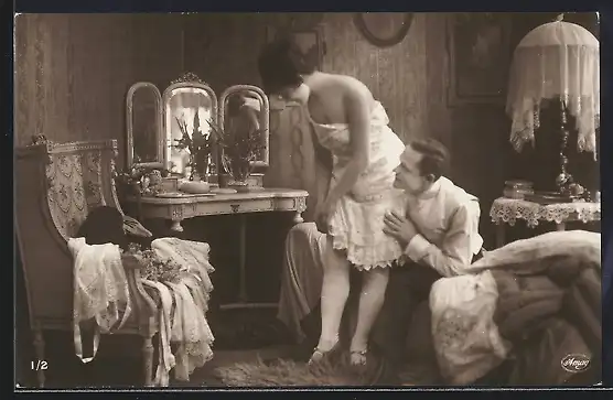 Foto-AK Amag Nr. 1 /2: Frisch vermähltes Paar vor der Hochzeitsnacht