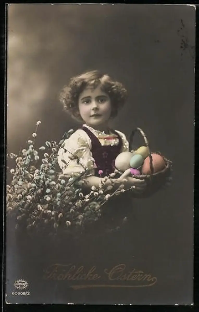 Foto-AK Amag Nr. 60908/2: Kind mit Ostereiern, Ostergruss
