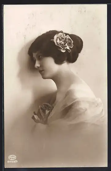 Foto-AK Amag Nr. 61145 /3: Junge Frau mit Blume im Haar, den Kopf an die Wand gelehnt