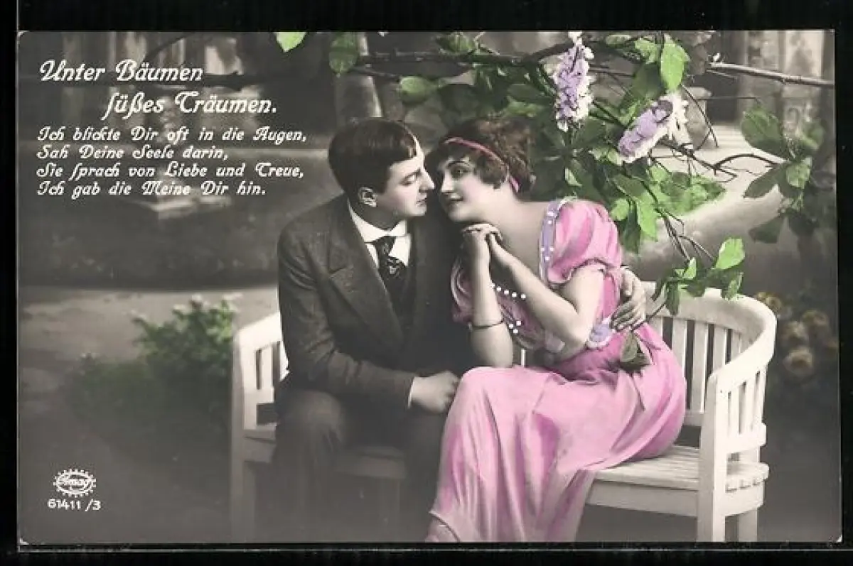 Foto-AK Amag Nr. 61411/3: Junges Paar auf einer Bank unter einem Baum