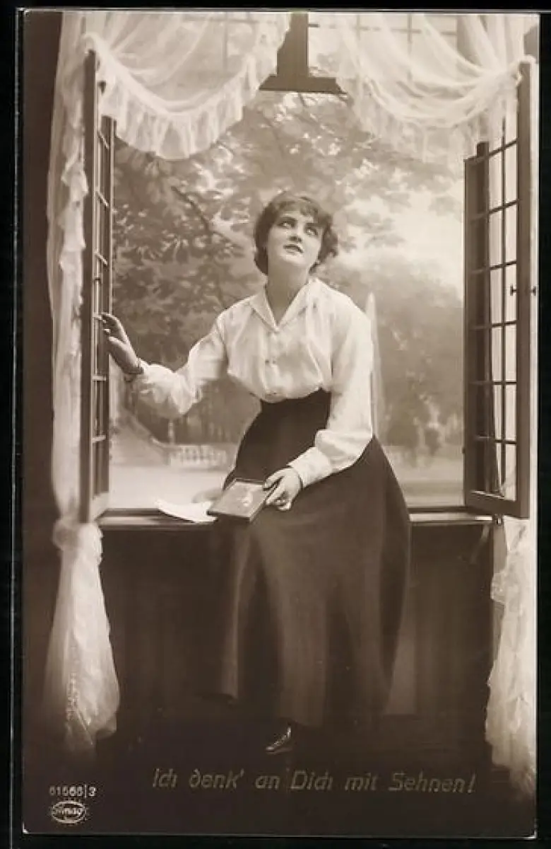 Foto-AK Amag Nr. 61566/3: Junge Frau am Fenster mit erhobenem Blick