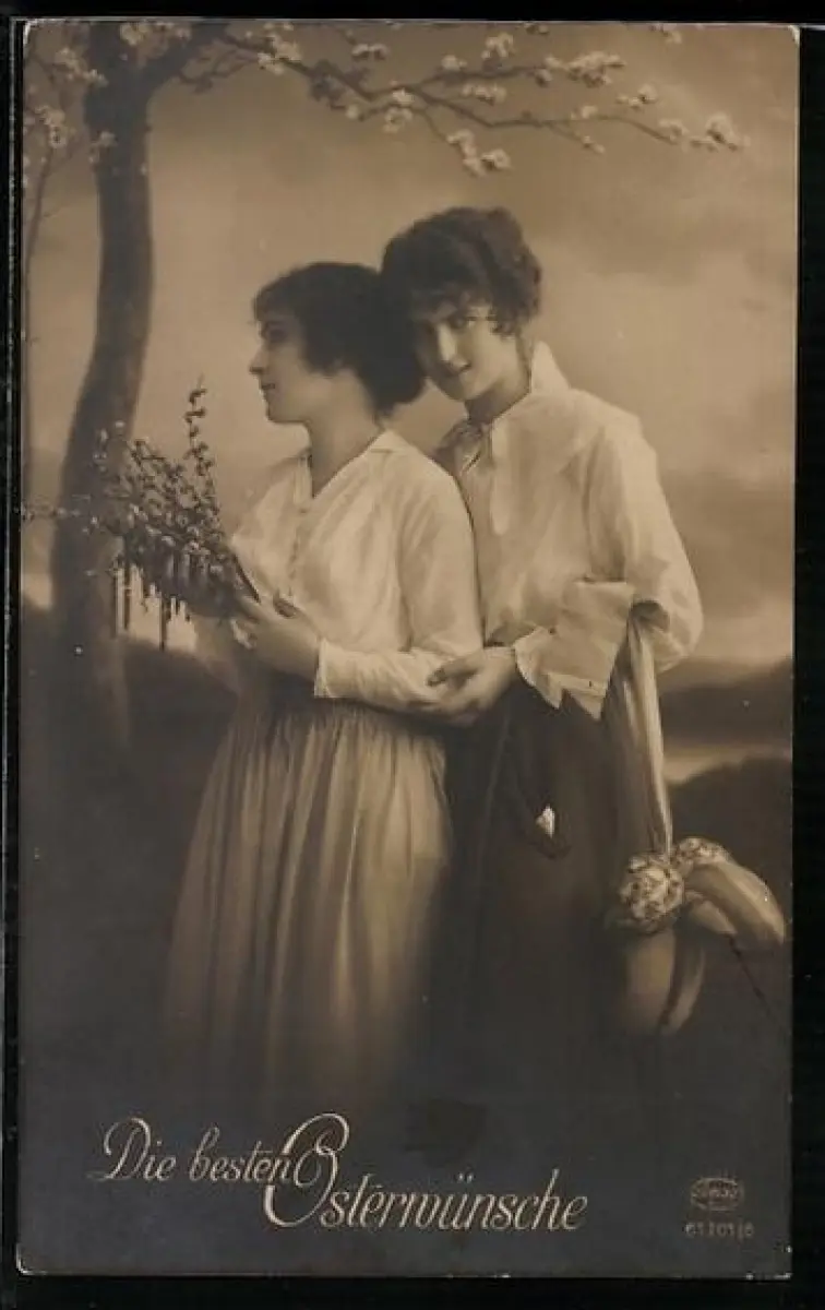 Foto-AK Amag Nr. 61701/6: Zwei junge Frauen mit Zweigen, Ostergruss
