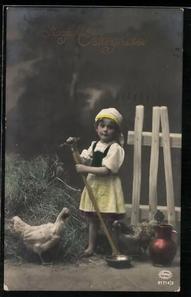 Foto-AK Amag Nr. 61714/2: Mädchen mit Huhn, Ostergruss