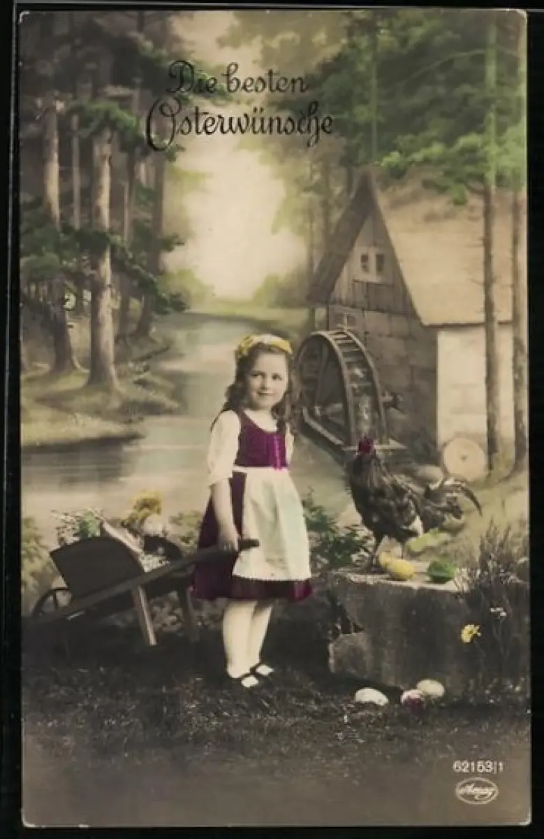 Foto-AK Amag Nr. 62153/1: Kleines Mädchen mit Huhn, Ostergruss