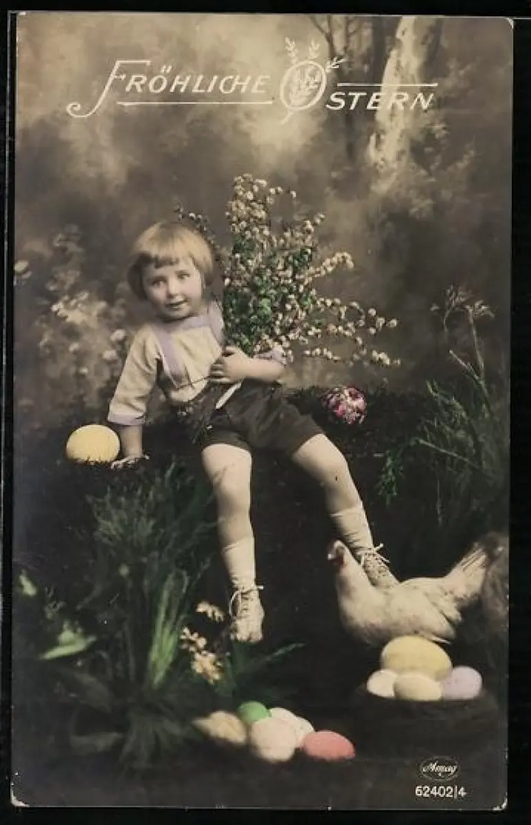 Foto-AK Amag Nr. 62402/4: Kleiner Junge mit Zweigen, Ostergruss