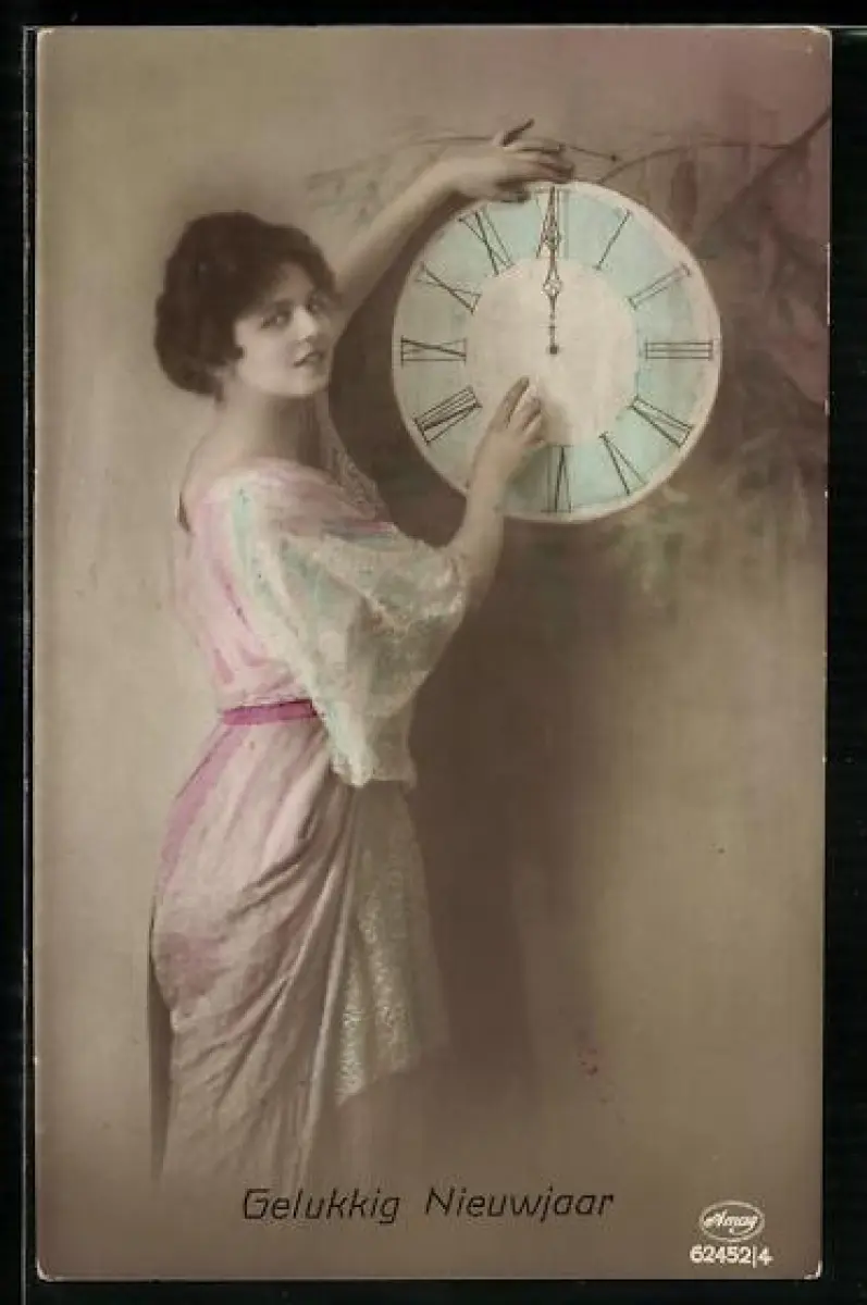 Foto-AK Amag Nr. 62452/4: Junge Frau an einer Uhr zu Mitternacht, Neujahrswünsche