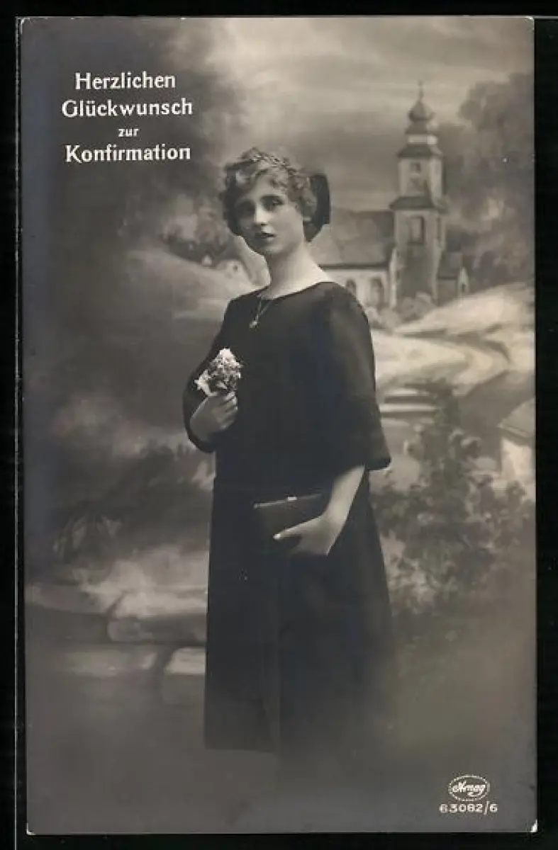 Foto-AK Amag Nr. 63082/6: Junge Frau im Kleid, Im Hintergrund Kirche, Glückwunsch zur Konfirmation