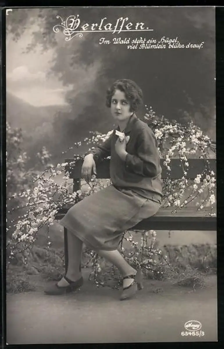 Foto-AK Amag Nr. 63455/3: Verlassen, Im Wald steht ein Hügel..., Junge Frau auf Bank