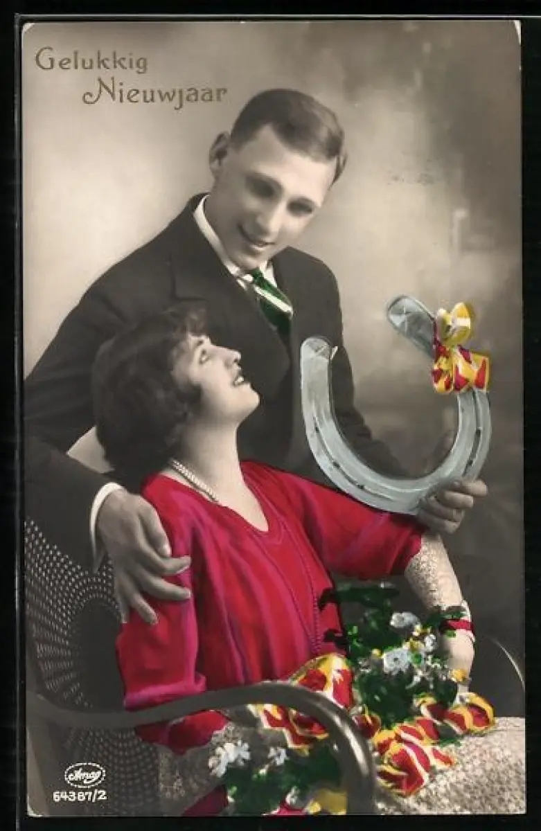 Foto-AK Amag Nr. 64387/2: Paar mit einem Hufeisen, Neujahrsgruss