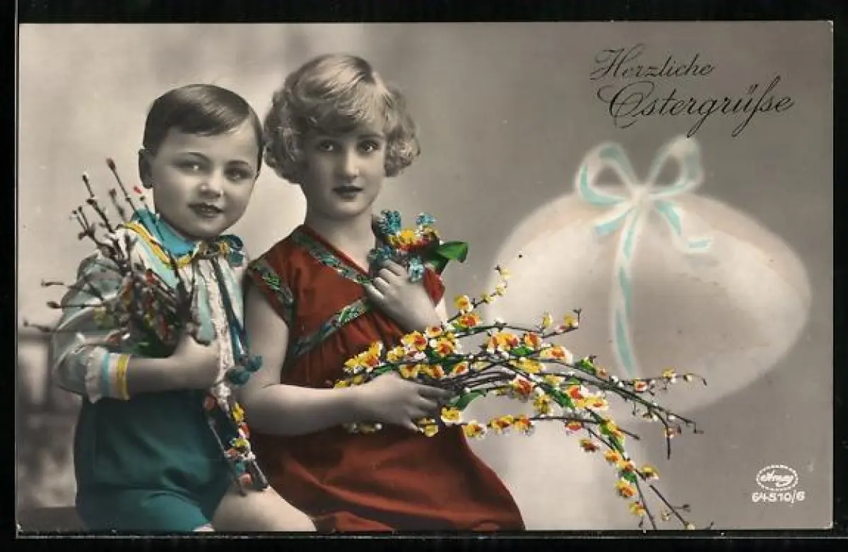 Foto-AK Amag Nr. 64510/6: Mädchen und Junge mit Zweigen und Weidenkätzchen