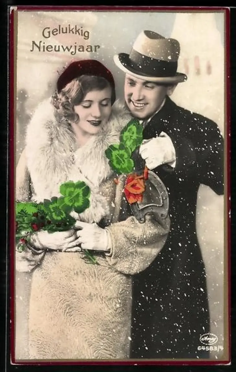 Foto-AK Amag Nr. 64583/4: Mann in Mantel und Hut mit seiner Frau bei Schneefall