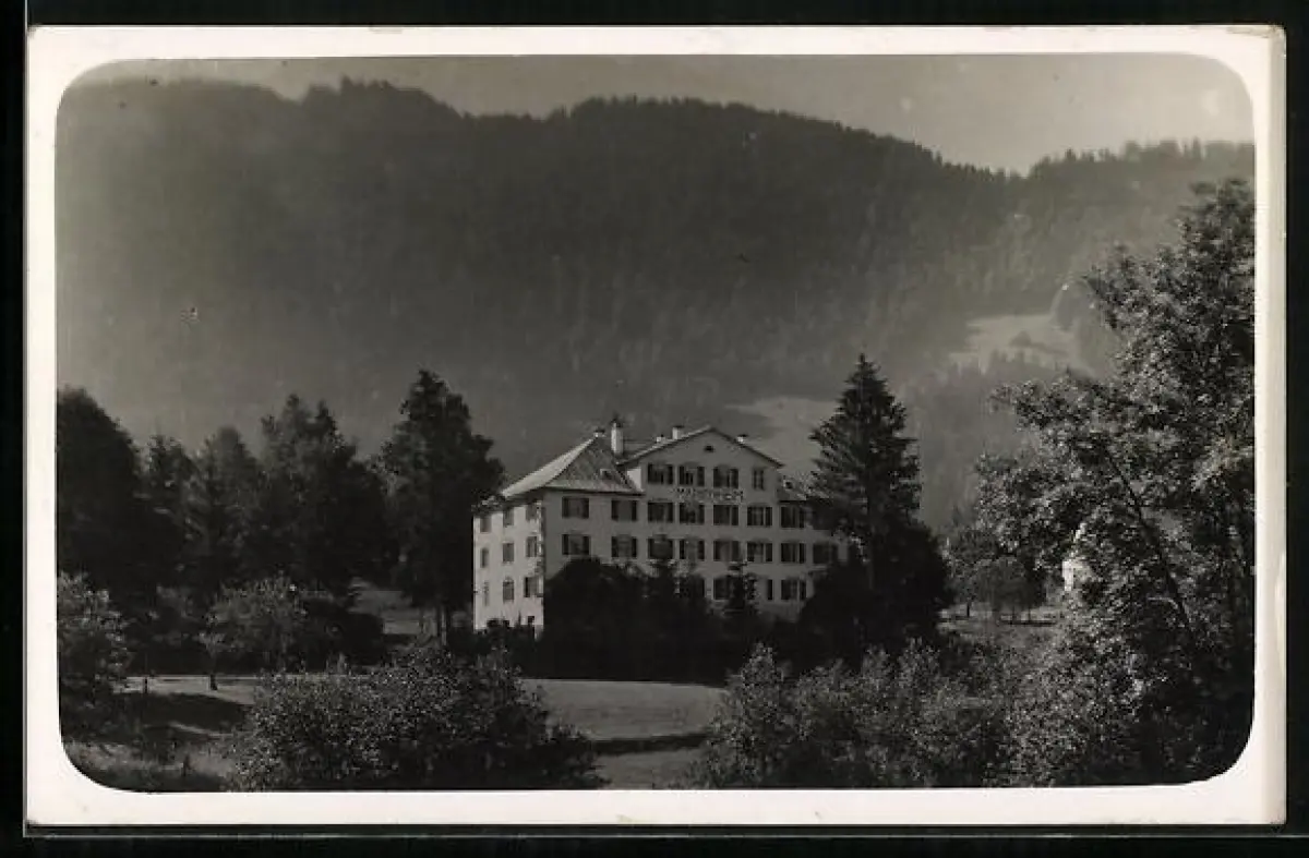Foto-AK Andelsbuch, Ortspartie mit Marienheim am Abend