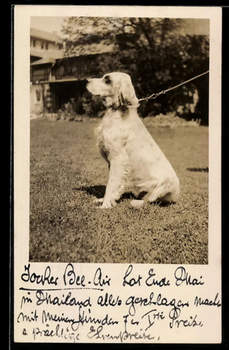 Foto-AK Angeleinter Jagdhund im Sitz auf einem Rasen