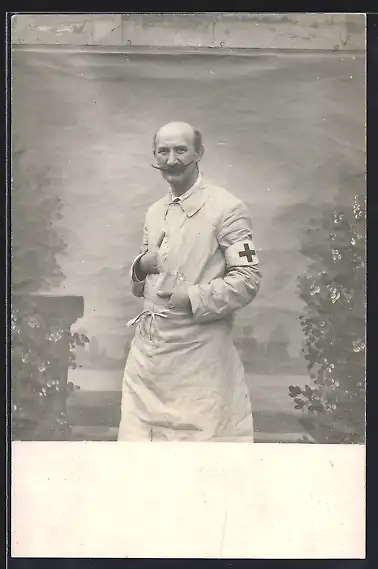 Foto-AK Arzt in Arbeitskleidung vor einer Kulisse