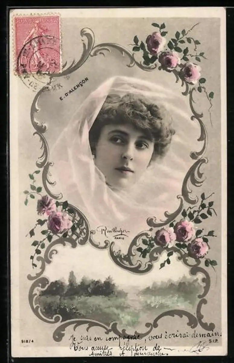 Foto-AK Atelier Reutlinger, Paris: Schauspielerin E. D`Alencon mit Schleier in Umrahmung mit Blumen und Landschaft