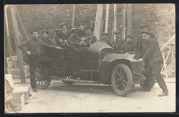 Foto-AK Auto, Arbeiter stehen um ein KFZ